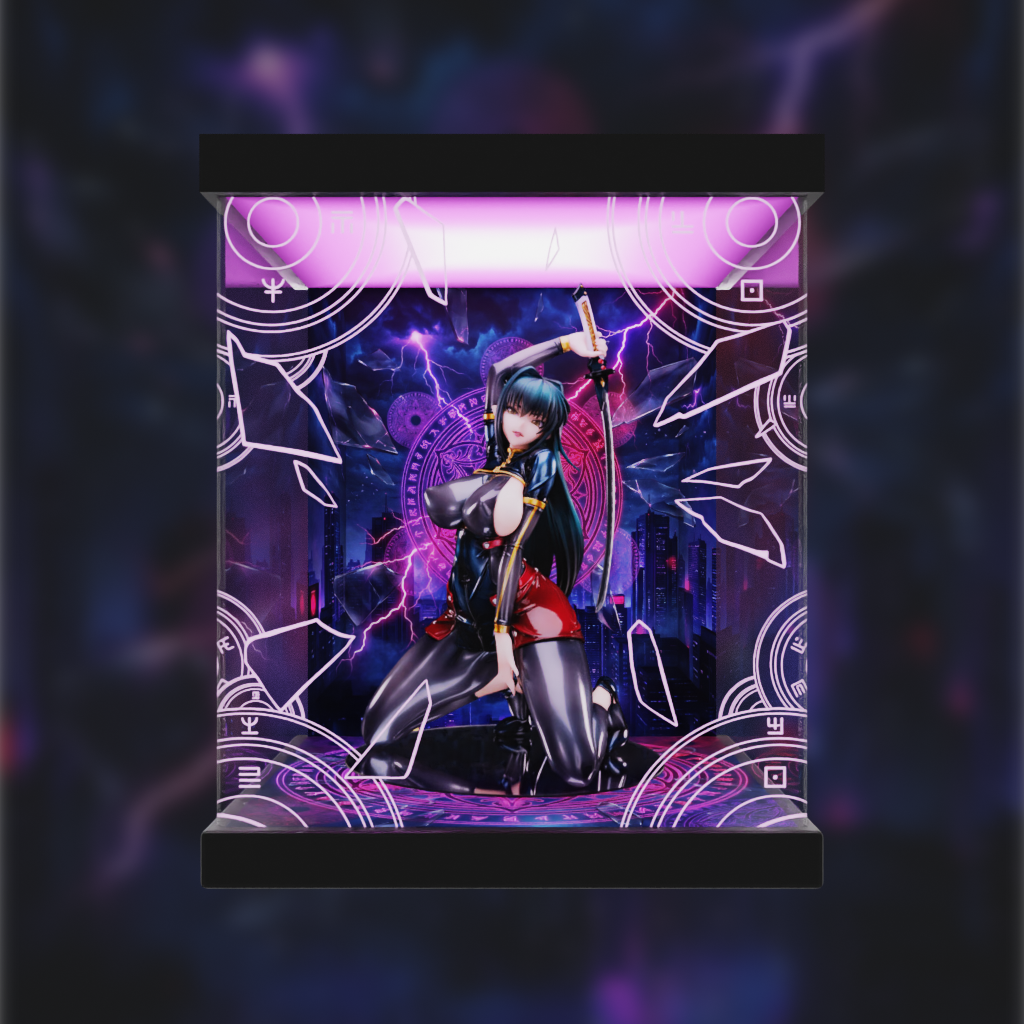 為 Pure 對魔忍RPGX 鋼之魔女 安妮羅傑 瓦裘拉 手辦設計的展示盒,主題背景,高清透亮面板,提升展品場景氛圍,同時免受塵封困擾