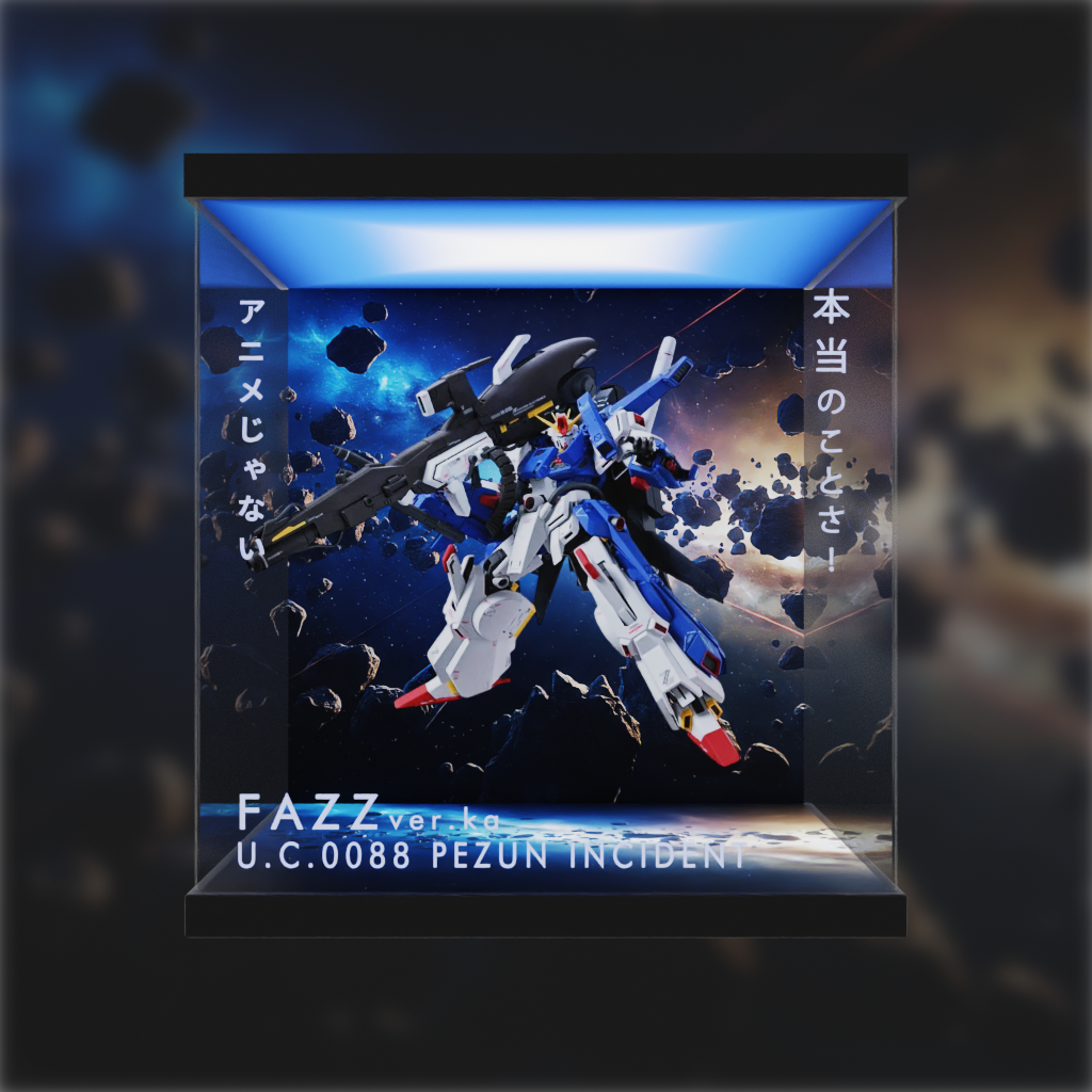 為 MG 1100 全裝甲型ZZ高達 Ka版 手辦設計的展示盒,主題背景,高清透亮面板,提升展品場景氛圍,同時免受塵封困擾