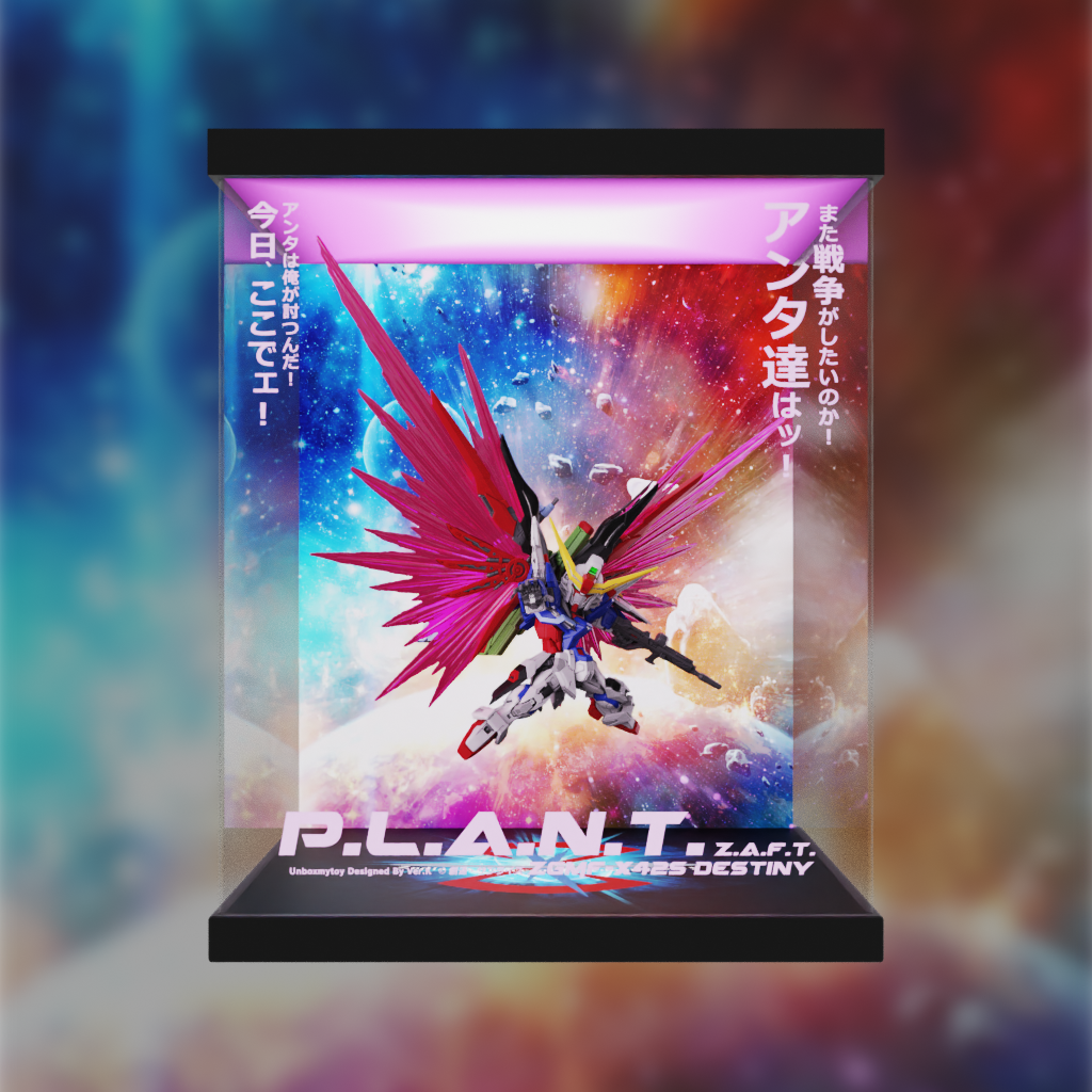 為 MGSD 命運光翼 高達 光學幻象版 手辦設計的展示盒,主題背景,高清透亮面板,提升展品場景氛圍,同時免受塵封困擾