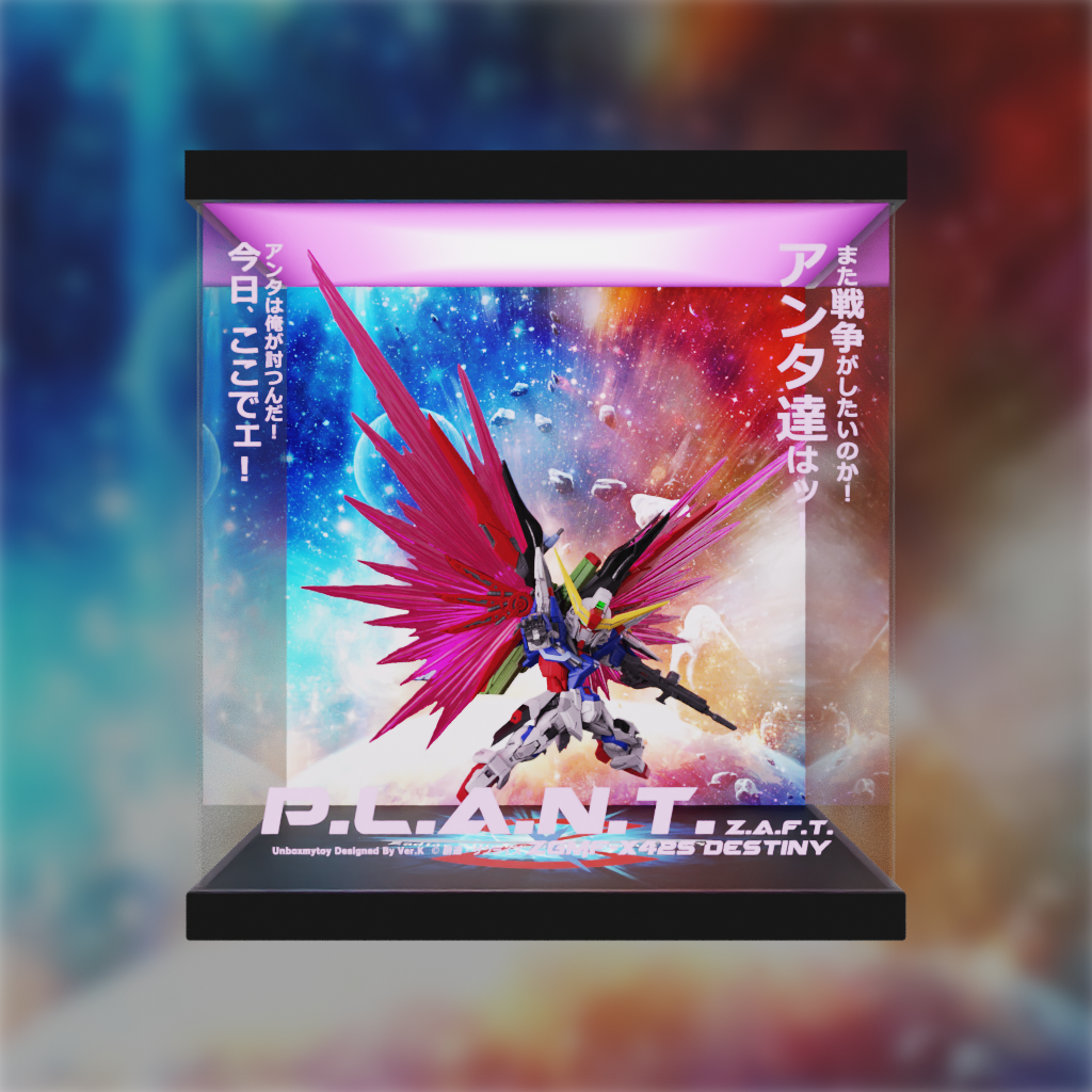 為 MGSD 命運光翼 高達 光學幻象版 手辦設計的展示盒,主題背景,高清透亮面板,提升展品場景氛圍,同時免受塵封困擾